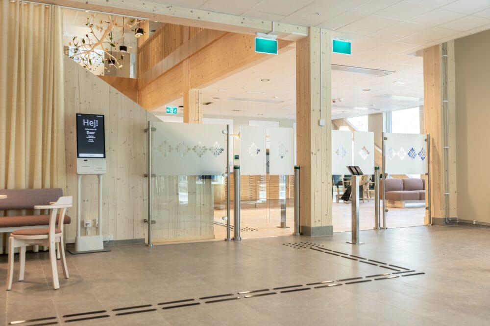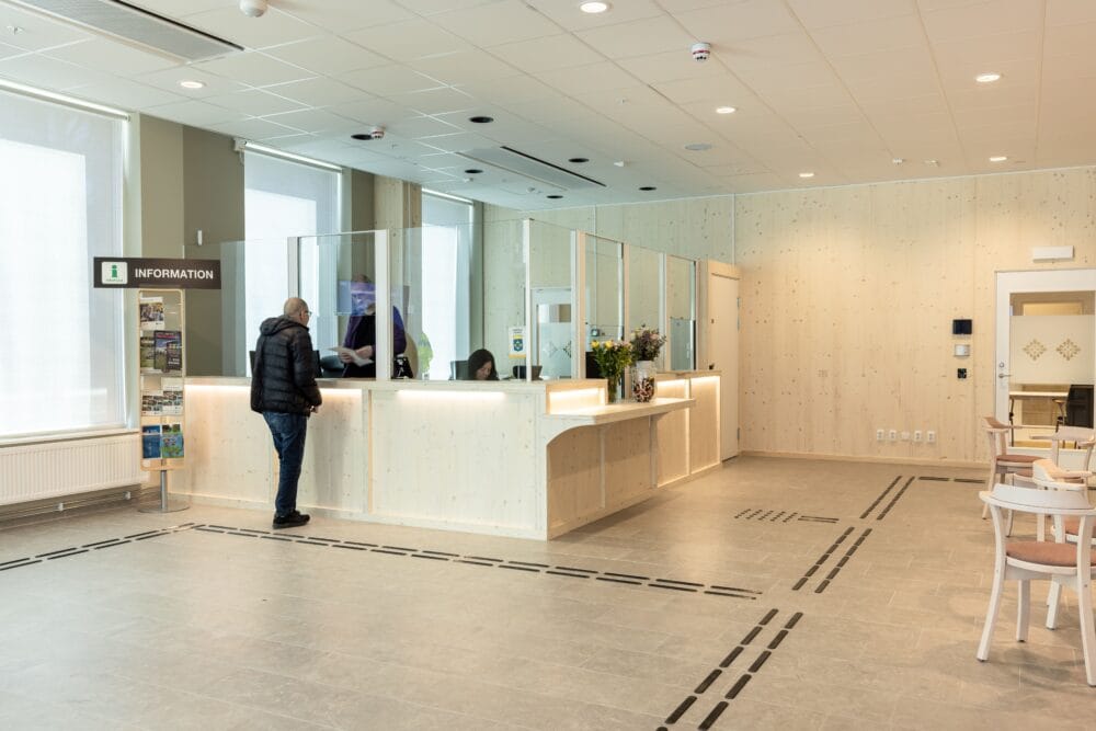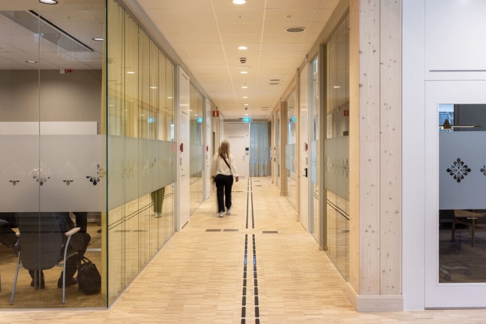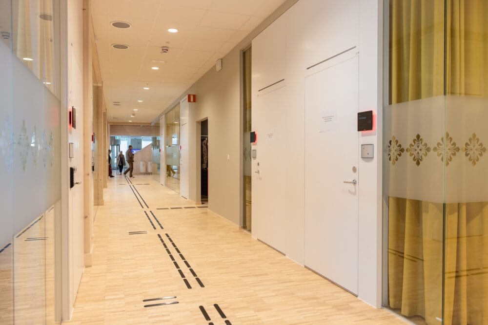 Det taktila ledstråket i Enköpings nya kommunhus löper genom hela entréplanet – från entré, förbi passergate, till reception, vidare till RWC och hela vägen till besöksrum och kontor. Ett helt flöde, inte bara en punktinsats. Onödigt mycket, tycker vissa. Självklart, tycker vi! För den som behöver orientera sig utan hjälp av synen är ett taktilt ledstråk inte bara en detalj – utan ofta helt avgörande. Och här har man alltså gjort det enkelt att göra rätt – hela vägen runt.