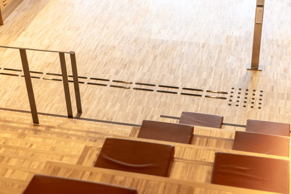 Valet av produkt speglar samma inställning som resten av byggnaden; Safestep Svartbäcken i rostfritt stål med svart PVD-beläggning för hög kontrast och slitstyrka, monterade direkt på trägolvet vilkey ger en tydlig visuell vägledning och ett uttryck som håller över tid. Inte den billigaste vägen – men den som passar byggnaden bäst!