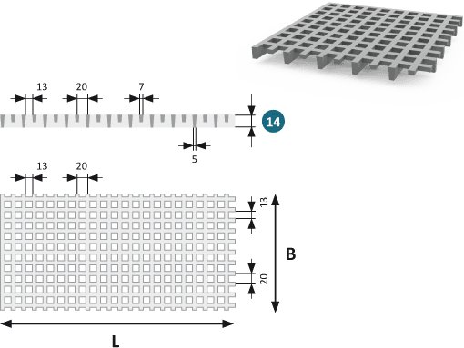 GRP Gallerdurk 14 Micro är en finmaskig gallerdurk med en höjd på endast 14 mm och en maskstorlek på 20×20 mm (13×13 mm invändigt). Durken är tillverkad i glasfiberarmerad plast (GRP) och passar utmärkt i miljöer där krav på halkskydd, kemikaliebeständighet och låg bygghöjd är avgörande.