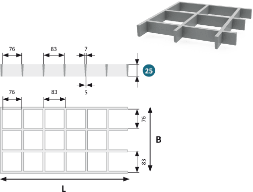 GRP Gallerdurk 25 med maska 83×83 mm (invändigt 76×76 mm) är en kraftig gallerdurk i glasfiberarmerad plast (GRP), konstruerad för att ge hög dräneringskapacitet och god mekanisk stabilitet i en lågbyggd profil. Med en höjd på 25 mm passar den särskilt bra för konstruktioner där god vattenavrinning och låg vikt spelar en viktig roll.