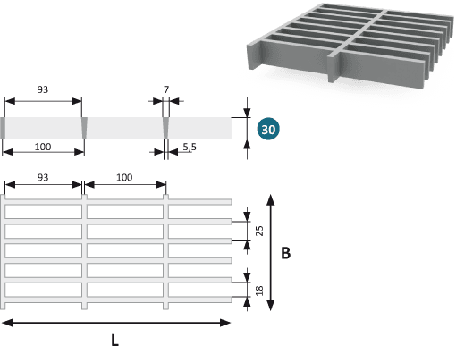 GRP Gallerdurk 30 med maska 100×25 mm (invändigt 93×18 mm) och en profilhöjd på 30 mm är en kraftig och dräneringsoptimerad gallerdurk tillverkad i glasfiberarmerad plast (GRP). Den långsmala maskstrukturen gör den särskilt effektiv i miljöer där snabb avrinning är viktigt, samtidigt som höjden ger god bärighet även vid belastning.