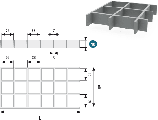 GRP Gallerdurk 40 är en extra kraftig gallerdurk tillverkad i glasfiberarmerad plast (GRP), med en höjd på 40 mm och en grov maskstruktur på 83×83 mm (76×76 mm invändigt). Durken är utvecklad för användning i miljöer och konstruktioner där mycket god dränering, hög belastningskapacitet och lång livslängd krävs.