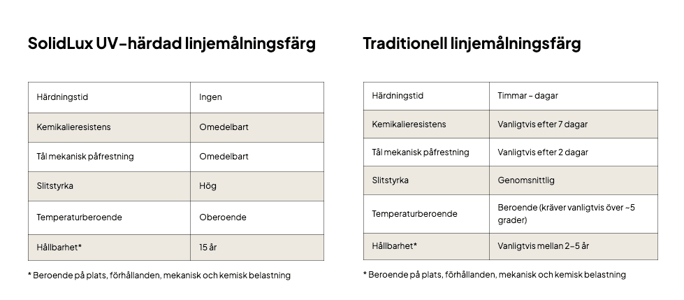 - Omedelbar härdning – minimal stilleståndstid: Till skillnad från traditionell linjemålning, som behöver timmar eller dagar för att härda fullständigt, härdar SolidLux-färgen direkt med hjälp av UV-ljus. Det möjliggör nästan omedelbar återgång till drift utan långa avbrott i verksamheten.