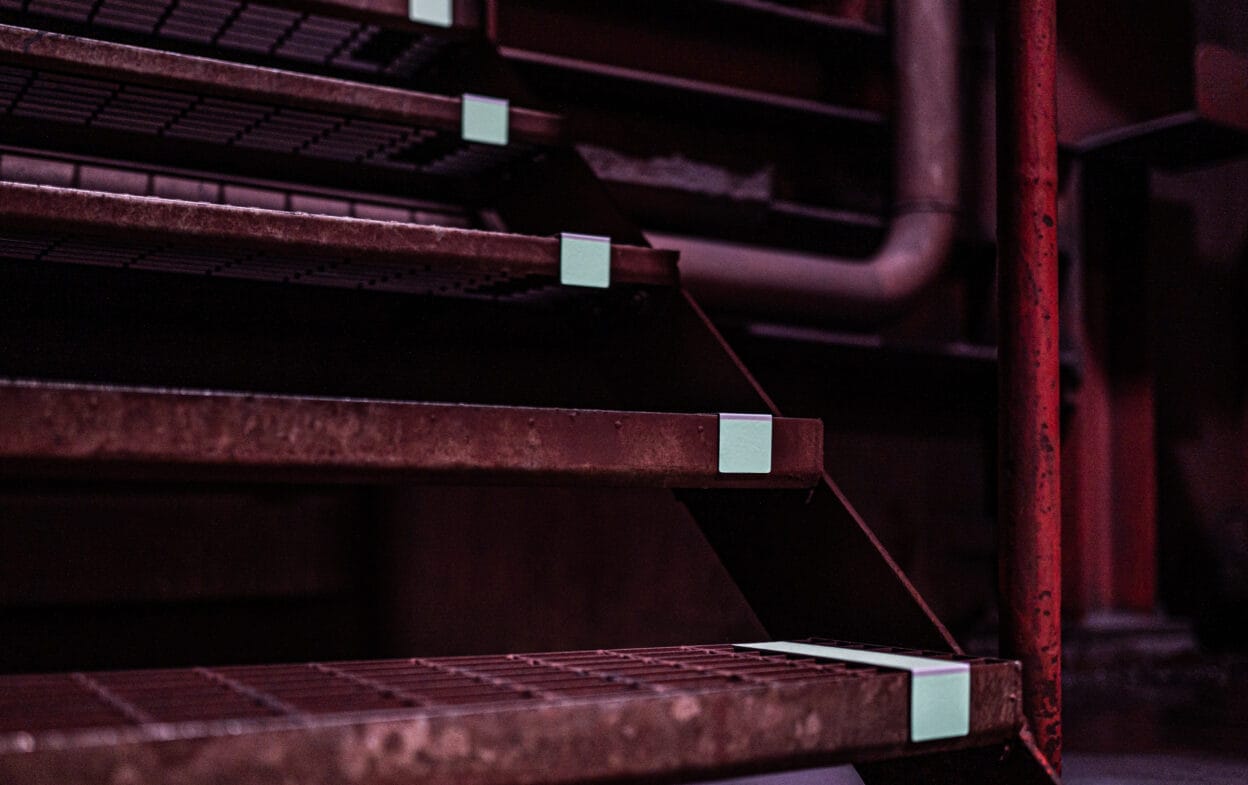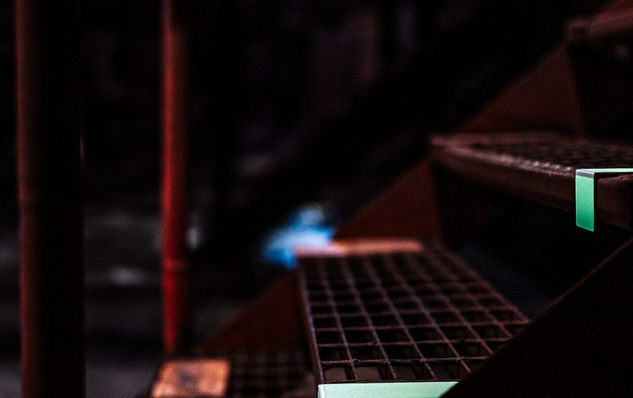 Högkvalitativa utrymningsmarkeringar kan vara avgörande vid en nödsituation och bör placeras på vardera sida av varje trappsteg.