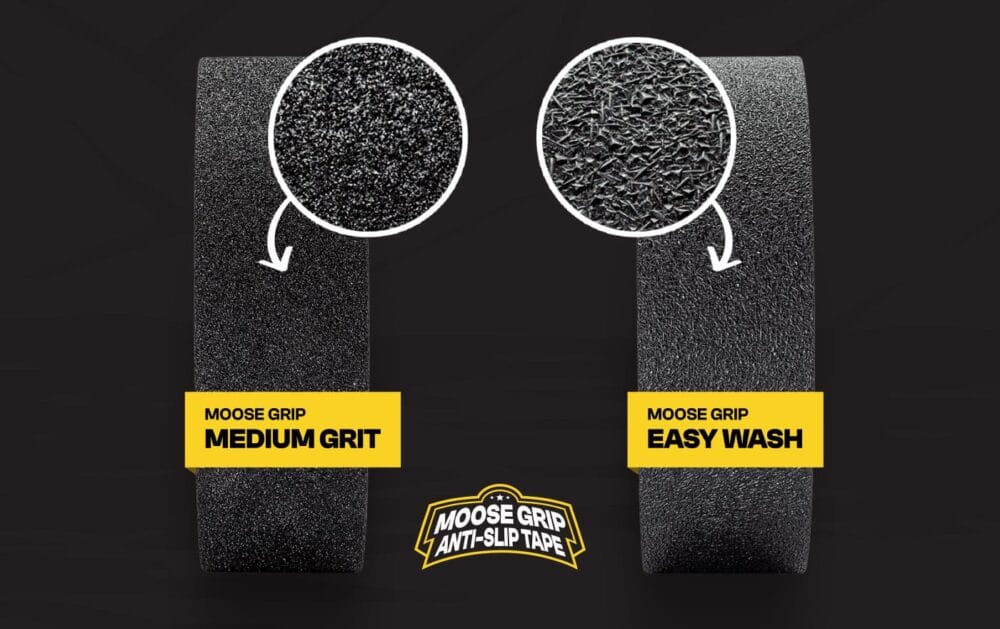 Halkskyddstejp MOOSE GRIP finns med två olika ytor, Medium grit eller Easy wash. Medium grit har en yta likt sandpapper – som en klassisk halkskyddstejp. Easy wash är inte lika grov och har i stället en plastyta med struktur, utvecklad för miljöer med högre krav på hygien.