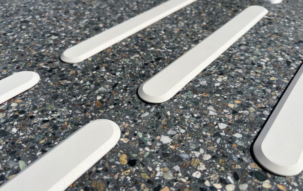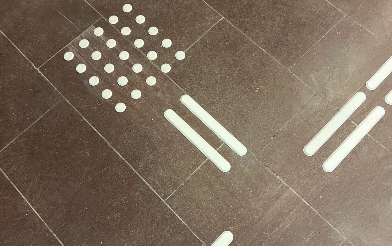 Taktila ledstråk i polyuretan – ledstav, stoppmarkering och kontrastmarkering.