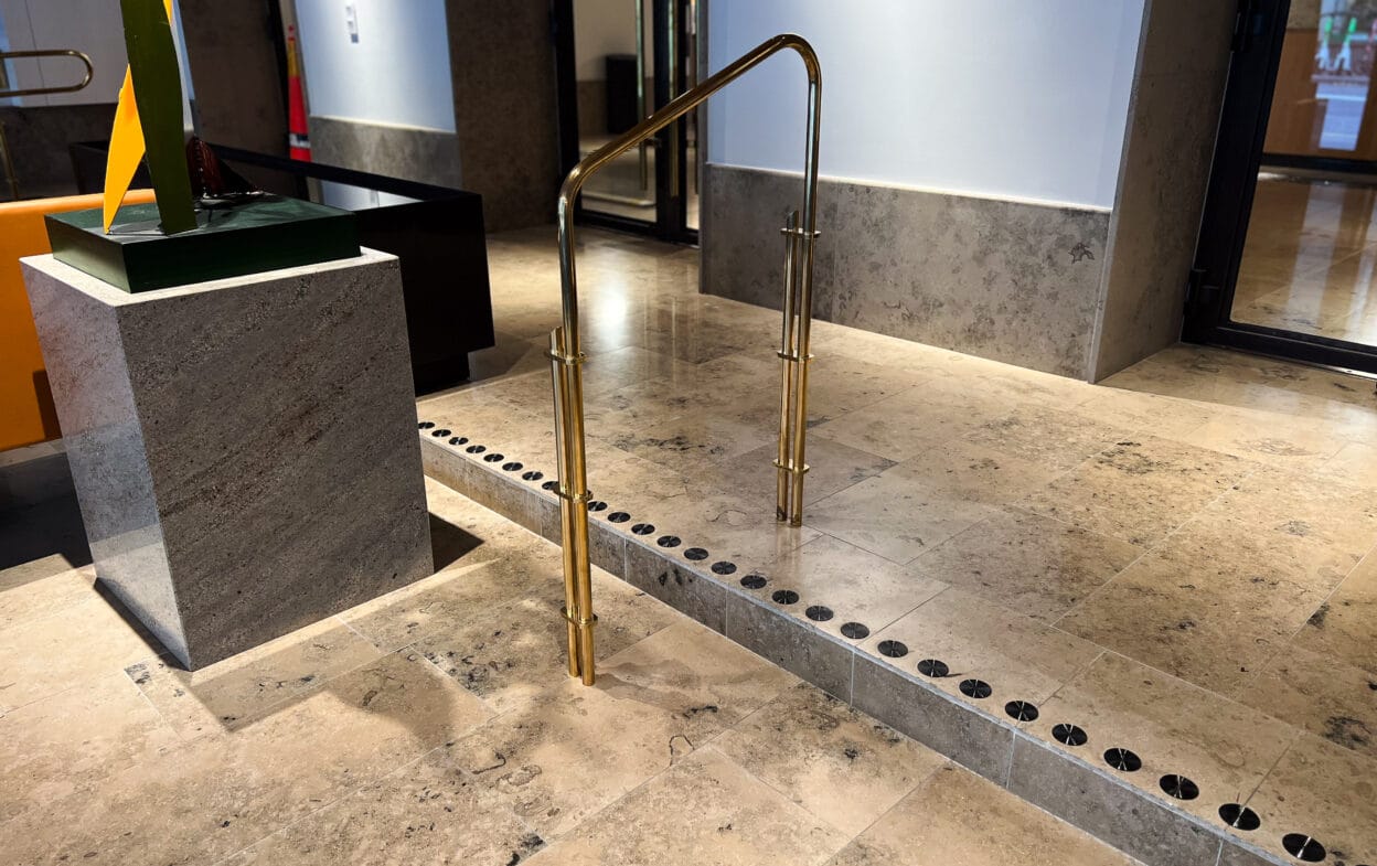 De taktila ledstråken ska också monteras med avvikande material och en ljushetskontrast på minst 0,4 NCS – antingen ljusare eller mörkare än omgivningen. Läs mer om alla regler och rekommendationer gällande taktila ledstråk här – eller ladda ner vår handbok nedan under Dokument.