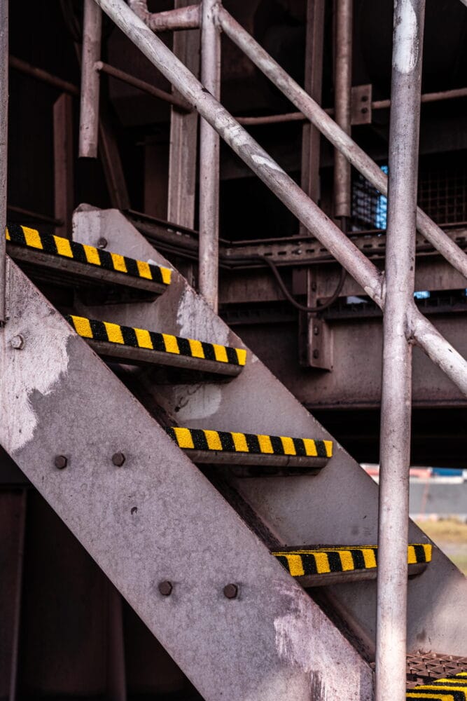 Varningsfärgade trappnoslister i glasfiber – för industrimiljöer.