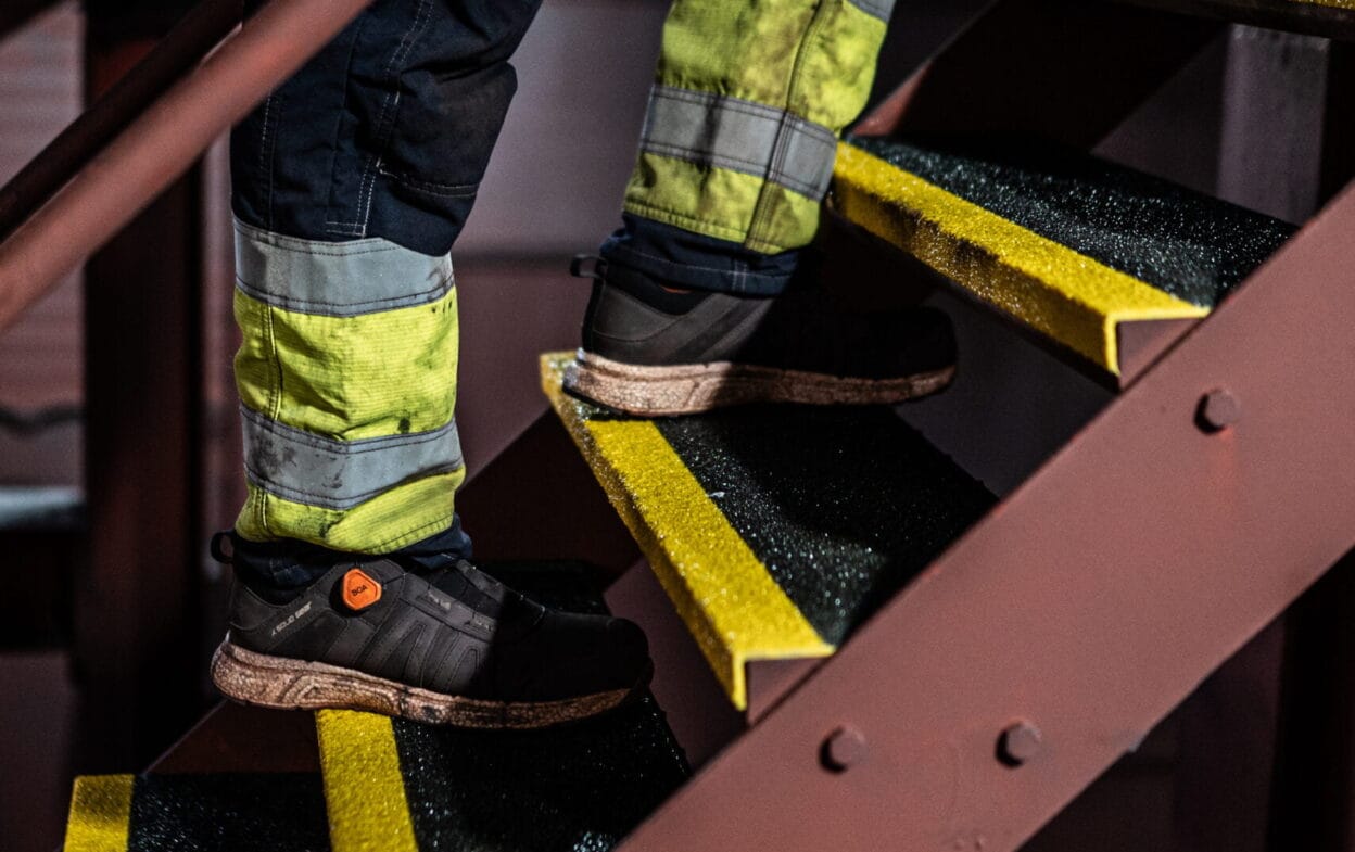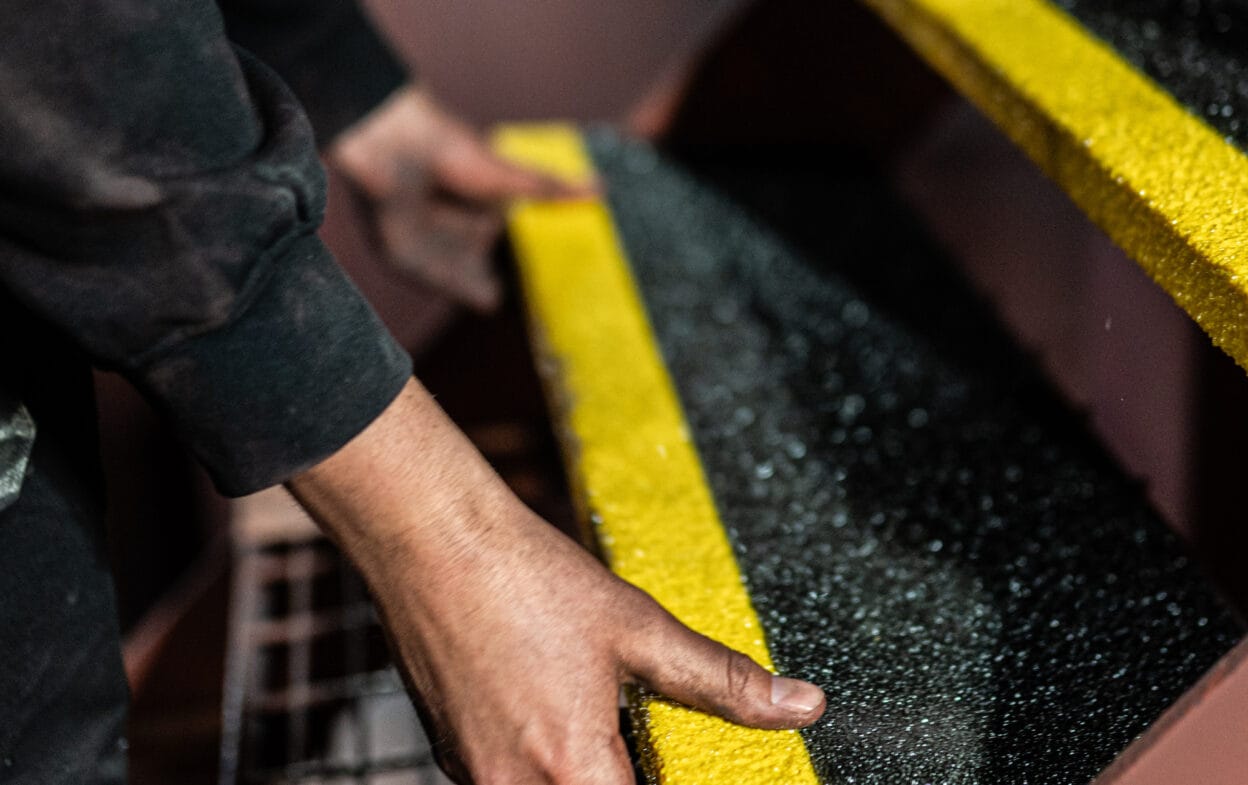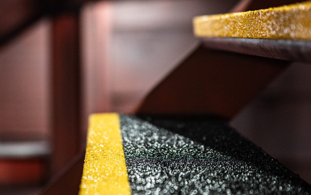 Glasfiberstegen är tillverkade av högkvalitativ glasfiber och har en grov sandad yta med korn av siliciumkarbid, vilket ger ett mycket slitstarkt resultat som lämpar sig för industri, offshore, marint och andra tunga industrier. En snabb och effektiv lösning – och ett betydligt mer långvarigt alternativ till tejp eller färg.